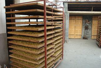 1、階段,升溫階段:將裝好菊花的托盤,平整的放入烘箱,不能重疊,避免托盤放置不好造成不必要的漏風。關閉箱門打開熱風爐風機,點燃熱風爐,開始向箱內(nèi)送熱風,逐漸將箱內(nèi)溫度加熱至50°,加熱30分鐘~1.5小時,看箱內(nèi)有濕氣時,開始排潮,大約排潮2分鐘左右,排潮后箱內(nèi)溫度會有所下降,繼續(xù)供熱。